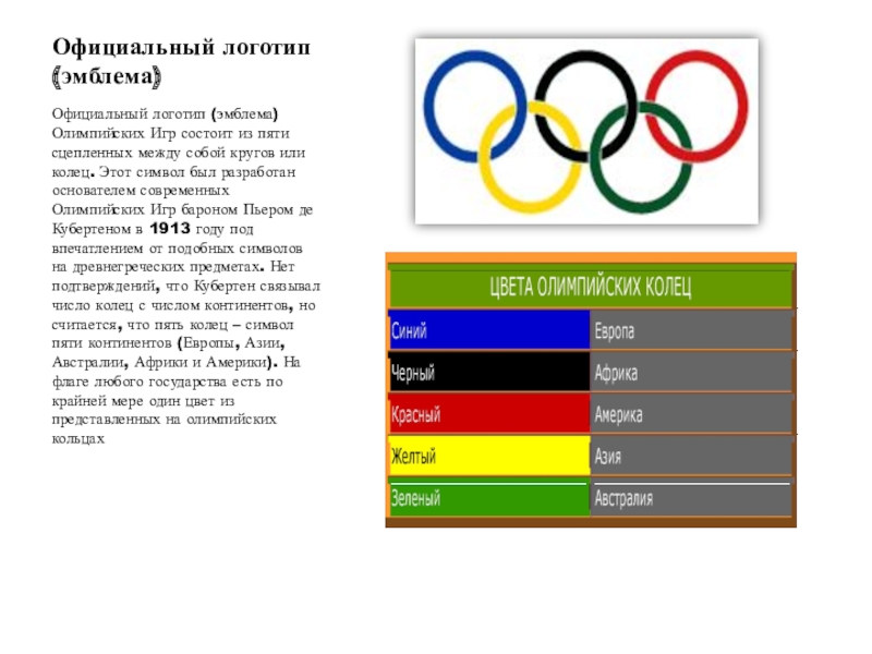 сцепленных между собой кругов или колец. Этот символ был разработан основателем современных Олимпийских Игр бароном Пьером де Кубертеном в 1913 году под впечатлением от подобных символов на древнегреческих предметах. Нет подтверждений, что Кубертен связывал число колец с числом континентов, но считается, что пять колец – символ пяти континентов (Европы, Азии, Австралии, Африки и Америки). На флаге любого государства есть по крайней мере один цвет из представленных на олимпийских кольцах