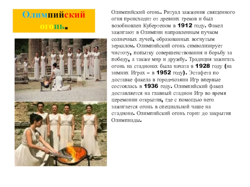 греков и был возобновлен Кубертеном в 1912 году. Факел зажигают в Олимпии направленным пучком солнечных лучей, образованных вогнутым зеркалом. Олимпийский огонь символизирует чистоту, попытку совершенствования и борьбу за победу, а также мир и дружбу. Традиция зажигать огонь на стадионах была начата в 1928 году (на зимних Играх – в 1952 году). Эстафета по доставке факела в город-хозяин Игр впервые состоялась в 1936 году. Олимпийский факел доставляется на главный стадион Игр во время церемонии открытия, где с помощью него зажигается огонь в специальной чаше на стадионе. Олимпийский огонь горит до закрытия Олимпиады.
