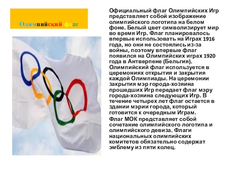 белом фоне. Белый цвет символизирует мир во время Игр. Флаг планировалось впервые использовать на Играх 1916 года, но они не состоялись из-за войны, поэтому впервые флаг появился на Олимпийских играх 1920 года в Антверпене (Бельгия). Олимпийский флаг используется в церемониях открытия и закрытия каждой Олимпиады. На церемонии закрытия мэр города-хозяина прошедших Игр передает флаг мэру города-хозяина следующих Игр. В течение четырех лет флаг остается в здании мэрии города, который готовится к очередным Играм.