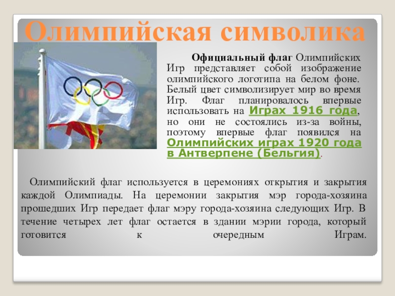 Олимпийский флаг используется в церемониях открытия и закрытия каждой Олимпиады. На церемонии закрытия мэр города-хозяина прошедших Игр передает флаг мэру города-хозяина следующих Игр. В течение четырех лет флаг остается в здании мэрии города, который готовится к очередным Играм.