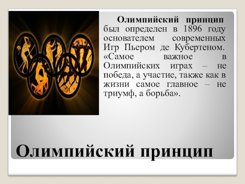 Автором Олимпийской хартии, олимпийской эмблемы и Олимпийской клятвы. «О спорт! Ты — мир!» — стал Пьер де Кубертен.