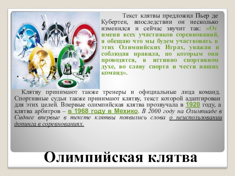 Клятву принимают также тренеры и официальные лица команд. Спортивные судьи также принимают клятву, текст которой адаптирован для этих целей. Впервые олимпийская клятва прозвучала в 1920 году, а клятва арбитров – в 1968 году в Мехико. В 2000 году на Олимпиаде в Сиднее впервые в тексте клятвы появились слова о неиспользовании допинга в соревнованиях.