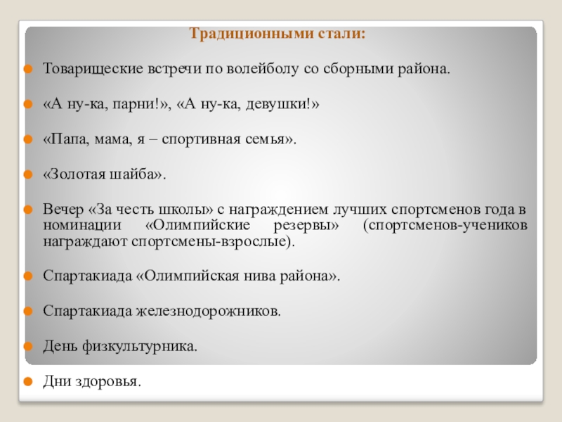 Участие и победы в районных соревнованиях по всем видам спорта, культивируемым в районе.