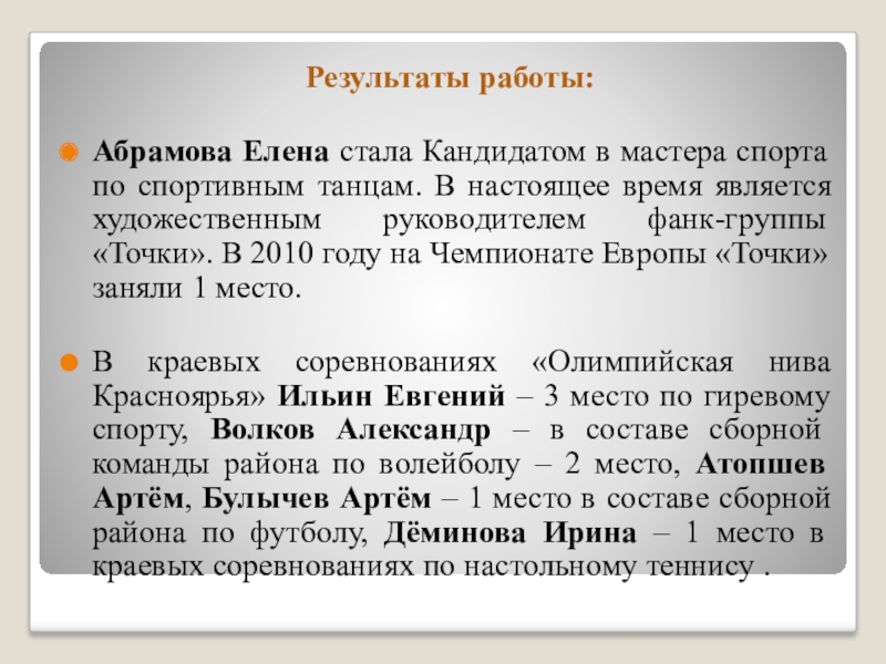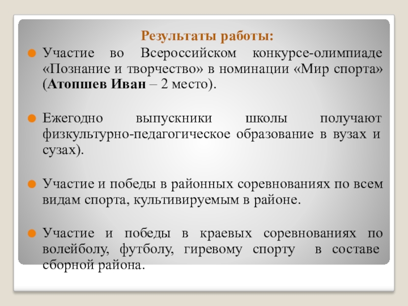 Участие и победы в краевых соревнованиях по волейболу, футболу, гиревому спорту в составе сборной района.