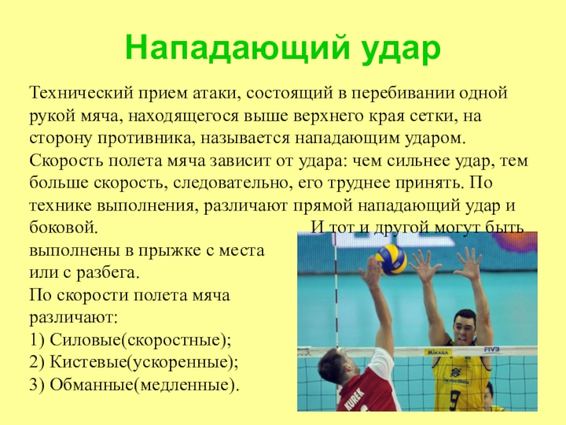 выше верхнего края сетки, на сторону противника, называется нападающим ударом. Скорость полета мяча зависит от удара: чем сильнее удар, тем больше скорость, следовательно, его труднее принять. По технике выполнения, различают прямой нападающий удар и боковой. И тот и другой могут быть выполнены в прыжке с места или с разбега. По скорости полета мяча различают: 1) Силовые(скоростные); 2) Кистевые(ускоренные); 3) Обманные(медленные).