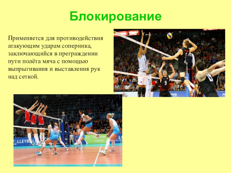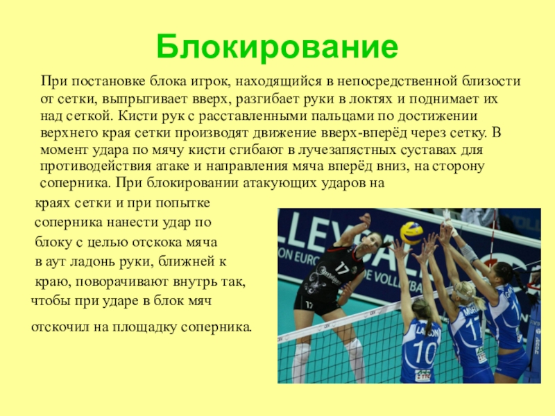 сетки, выпрыгивает вверх, разгибает руки в локтях и поднимает их над сеткой. Кисти рук с расставленными пальцами по достижении верхнего края сетки производят движение вверх-вперёд через сетку. В момент удара по мячу кисти сгибают в лучезапястных суставах для противодействия атаке и направления мяча вперёд вниз, на сторону соперника. При блокировании атакующих ударов на