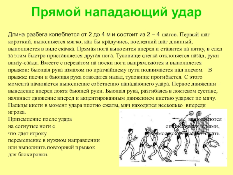 2 – 4 шагов. Первый шаг короткий, выполняется мягко, как бы крадучись, последний шаг длинный, выполняется в виде скачка. Прямая нога выносится вперед и ставится на пятку, в след за этим быстро приставляется другая нога. Туловище слегка отклоняется назад, руки внизу-сзади. Вместе с перекатом на носки ноги выпрямляются и выполняется прыжок: бьющая рука взмахом по кратчайшему пути поднимается над плечом. В прыжке плечи и бьющая рука отводится назад, туловище прогибается. С этого момента начинается выполнение собственно нападающего удара. Первое движении – выведение вперед локтя бьющей руки. Бьющая рука, разгибаясь в локтевом суставе, начинает движение вперед и акцентированным движением кистью ударяет по мячу. Пальцы кисти в момент удара плотно сжаты, мяч находится несколько впереди игрока. Приземление после удара выполняются на согнутые ноги с опущенными руками, что дает игроку возможность быстро начать перемещение в нужном направлении или выполнить повторный прыжок для блокировки.