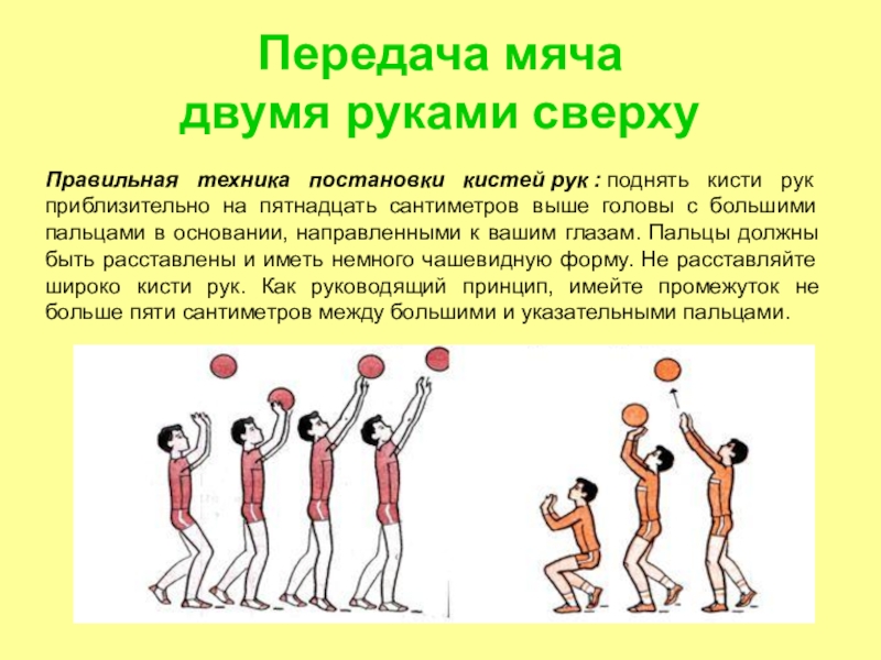 ноги на ширине плеч, согнутые в коленных суставах, одна впереди другой, руки выпрямлены и направлены вперед - вниз, локти приближены друг к другу, кисти соединены, туловище слегка наклонено вперед. При выполнении приема и передачи игрок располагается так, чтобы мяч был перед ним. Мяч принимается на предплечья, ближе к кистям рук. Движения прямыми руками вперед-вверх производятся только в плечевых суставах. Туловище выпрямляется, ноги активно разгибаются. Сопровождающее мяч движение выполняется за счет дальнейшего разгибания ног и туловища, а также плавного смещения рук вперед-вверх вслед за мячом.