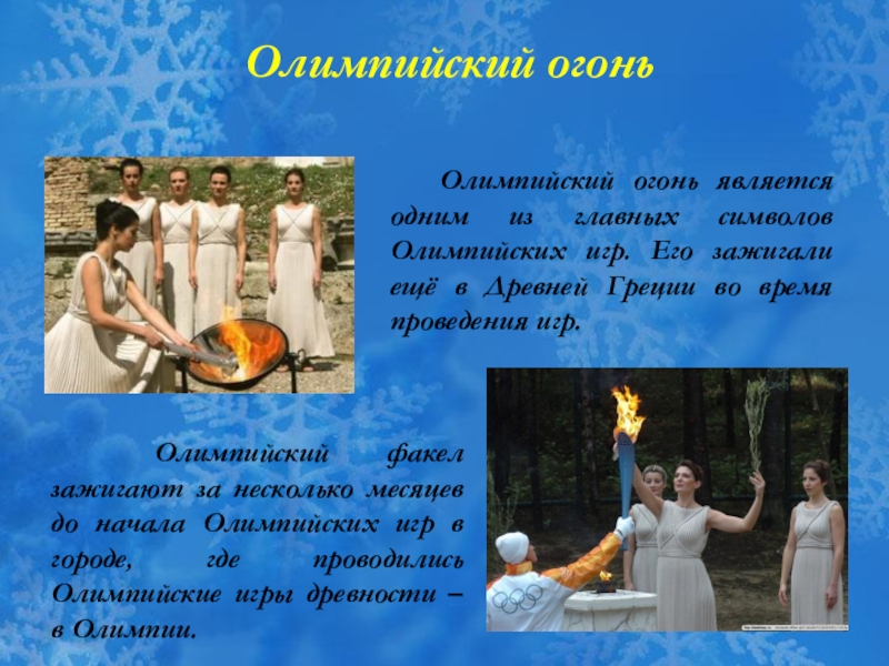 Олимпийский огонь является одним из главных символов Олимпийских игр. Его зажигали ещё в Древней Греции во время проведения игр.
