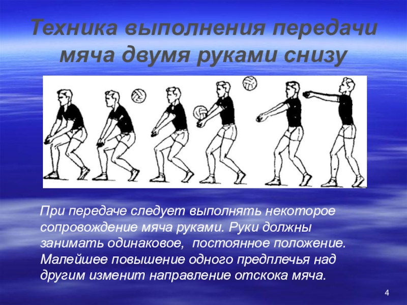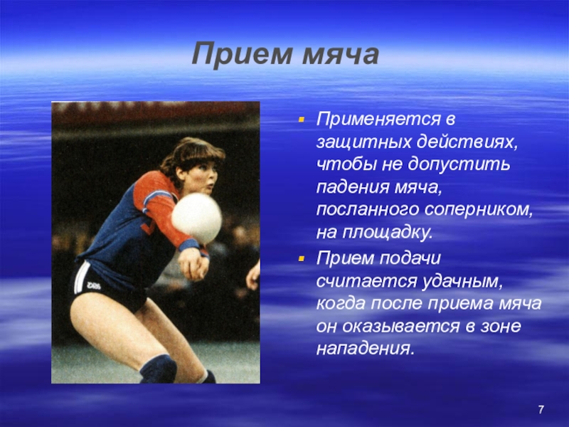 Применяют в основном юноши. Игрок как бы «ныряет» под мяч, после отбивания мяча руки касаются площадки и амортизируют касание грудью за счет сгибания рук, ноги сгибаются в коленях, туловище прогибается, руки после отталкивания вперед убирают вдоль туловища.