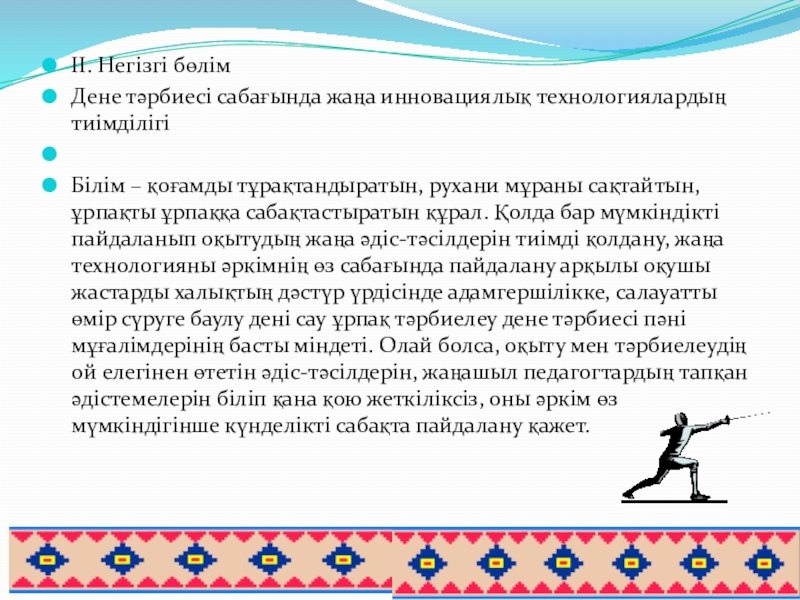 тұрақтандыратын, рухани мұраны сақтайтын, ұрпақты ұрпаққа сабақтастыратын құрал. Қолда бар мүмкіндікті пайдаланып оқытудың жаңа әдіс-тәсілдерін тиімді қолдану, жаңа технологияны әркімнің өз сабағында пайдалану арқылы оқушы жастарды халықтың дәстүр үрдісінде адамгершілікке, салауатты өмір сүруге баулу дені сау ұрпақ тәрбиелеу дене тәрбиесі пәні мұғалімдерінің басты міндеті. Олай болса, оқыту мен тәрбиелеудің ой елегінен өтетін әдіс-тәсілдерін, жаңашыл педагогтардың тапқан әдістемелерін біліп қана қою жеткіліксіз, оны әркім өз мүмкіндігінше күнделікті сабақта пайдалану қажет.