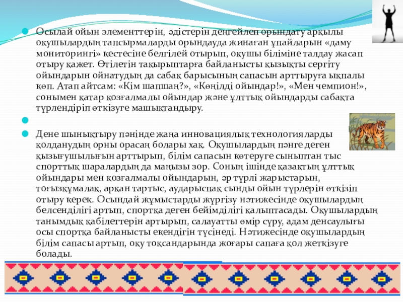 ұпайларын «даму мониторингі» кестесіне белгілей отырып, оқушы біліміне талдау жасап отыру қажет. Өтілетін тақырыптарға байланысты қызықты сергіту ойындарын ойнатудың да сабақ барысының сапасын арттыруға ықпалы көп. Атап айтсам: «Кім шапшаң?», «Көңілді ойындар!», «Мен чемпион!», сонымен қатар қозғалмалы ойындар және ұлттық ойындарды сабақта түрлендіріп өткізуге машықтандыру.