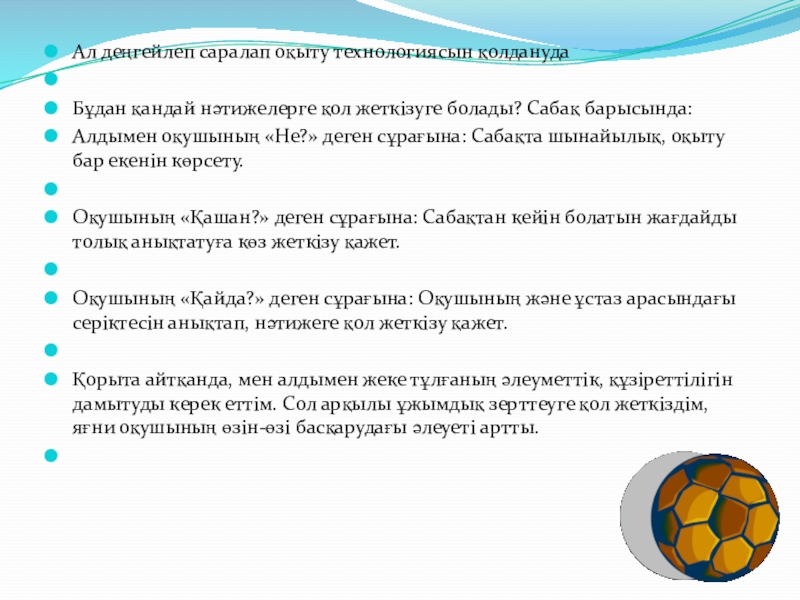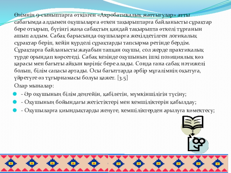 байланысты сұрақтар бере отырып, бүгінгі жаңа сабақтың қандай тақырыпта өткелі тұрғанын ашып алдым. Сабақ барысында оқушыларға жеңілдетілген логикалық сұрақтар беріп, кейін күрделі сұрақтарды тапсырма ретінде бердім. Сұрақтарға байланысты жауабын тапқан оқушы, сол жерде практикалық түрде орындап көрсетеді. Сабақ кезінде оқушының ішкі позициялық көз қарасы мен бағыты айқын көрініс бере алады. Сонда ғана сабақ нәтижелі болып, білім сапасы артады. Осы бағыттарда әрбір мұғалімнің оқытуға, үйретуге өз тұғырнамасы болуы қажет. [3.5]