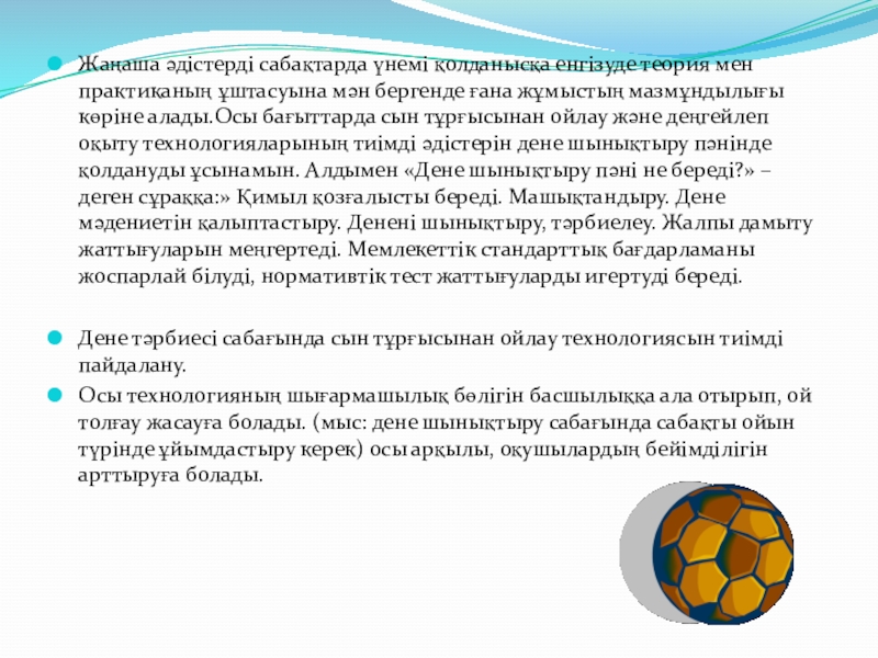 бергенде ғана жұмыстың мазмұндылығы көріне алады.Осы бағыттарда сын тұрғысынан ойлау және деңгейлеп оқыту технологияларының тиімді әдістерін дене шынықтыру пәнінде қолдануды ұсынамын. Алдымен «Дене шынықтыру пәні не береді?» –деген сұраққа:» Қимыл қозғалысты береді. Машықтандыру. Дене мәдениетін қалыптастыру. Денені шынықтыру, тәрбиелеу. Жалпы дамыту жаттығуларын меңгертеді. Мемлекеттік стандарттық бағдарламаны жоспарлай білуді, нормативтік тест жаттығуларды игертуді береді.