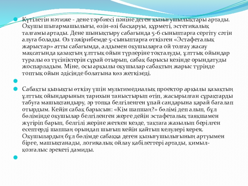 Слайд 11Күтілетін нәтиже - дене тәрбиесі пәніне деген қызығушылықтары артады. Оқушы шығармашылығы,