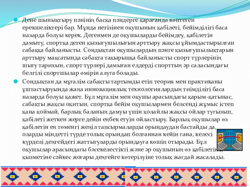 Слайд 8Дене шынықтыру пәнінің басқа пәндерге қарағанда көптеген ерекшеліктері бар. Мұнда негізінен