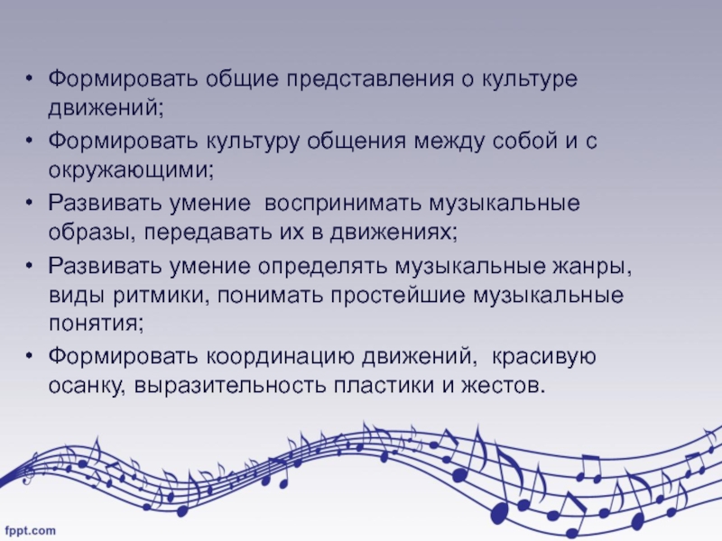 Формировать координацию движений, красивую осанку, выразительность пластики и жестов.