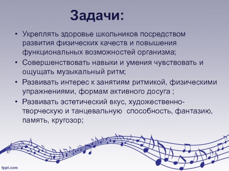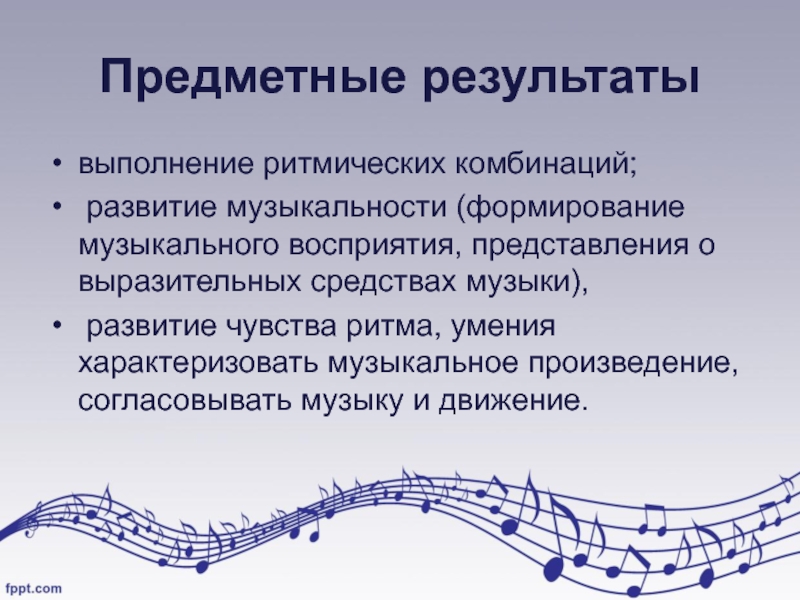 развитие чувства ритма, умения характеризовать музыкальное произведение, согласовывать музыку и движение.
