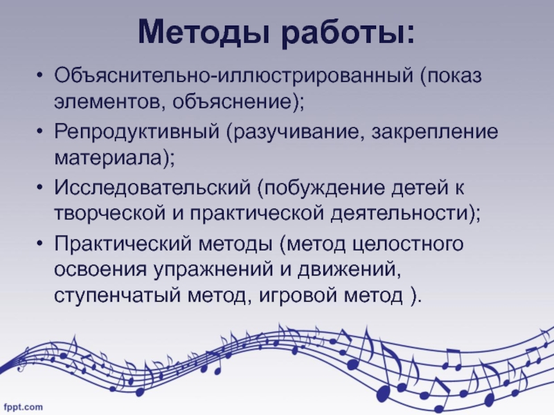 Практический методы (метод целостного освоения упражнений и движений, ступенчатый метод, игровой метод ).