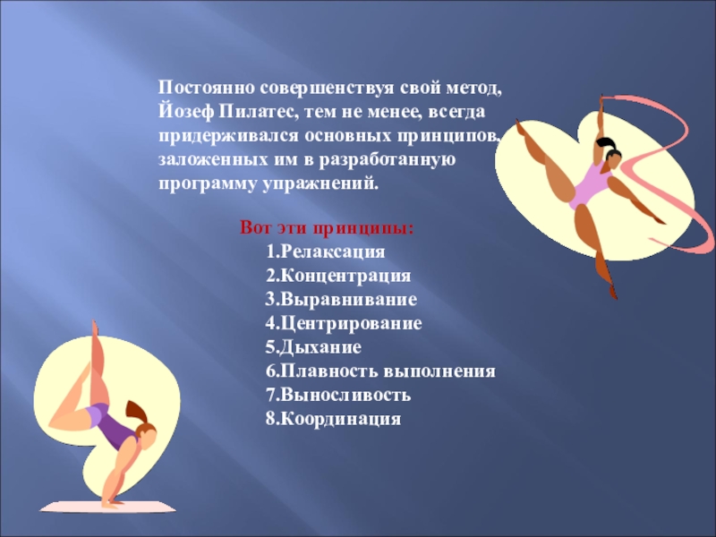 Метод Пилатеса основан на движении, он не приемлет статического положения, как в йоге. Все упражнения выполняются в медленном темпе, но без остановки, без фиксации. При этом постоянно сохраняется огромное мышечное напряжение. Движения выполняются плавно, в направлении от сильного центра.