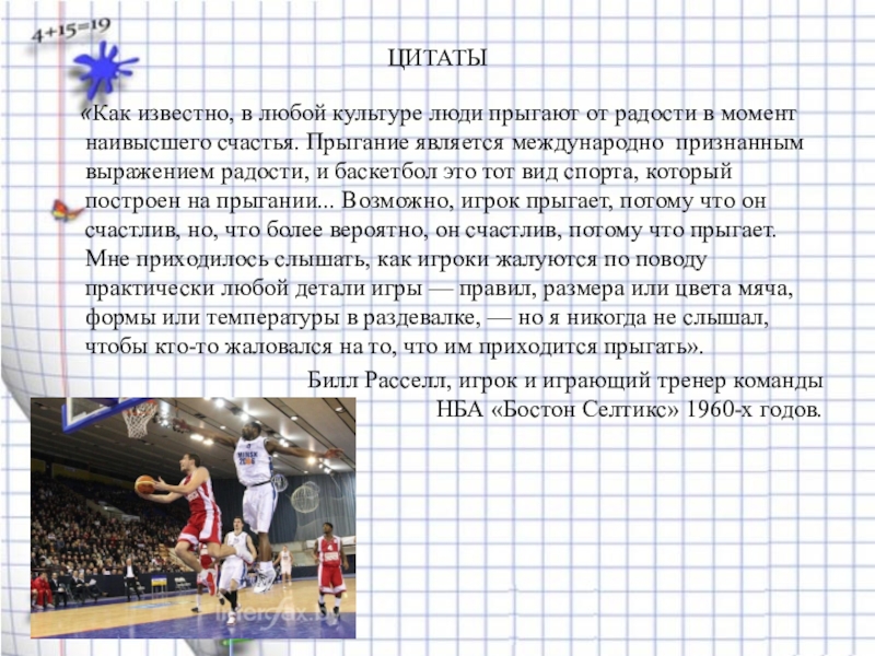 в момент наивысшего счастья. Прыгание является международно признанным выражением радости, и баскетбол это тот вид спорта, который построен на прыгании... Возможно, игрок прыгает, потому что он счастлив, но, что более вероятно, он счастлив, потому что прыгает. Мне приходилось слышать, как игроки жалуются по поводу практически любой детали игры — правил, размера или цвета мяча, формы или температуры в раздевалке, — но я никогда не слышал, чтобы кто-то жаловался на то, что им приходится прыгать».