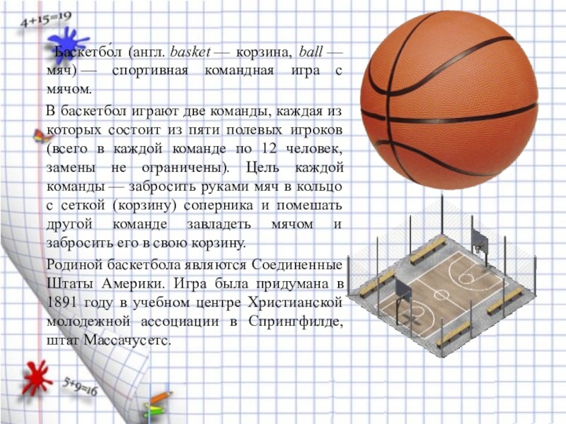 Баскетбо́л (англ. basket — корзина, ball —мяч) — спортивная