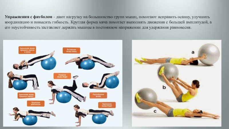 Слайд 8Упражнения с фитболом - дают нагрузку на большинство групп мышц, помогают