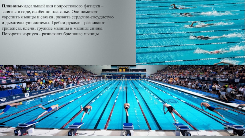 Слайд 10Плаванье-идеальный вид подросткового фитнеса – занятия в воде, особенно плаванье. Оно
