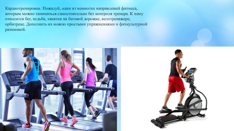 Слайд 11Кардиотренировки. Пожалуй, один из немногих направлений фитнеса, которым можно заниматься самостоятельно