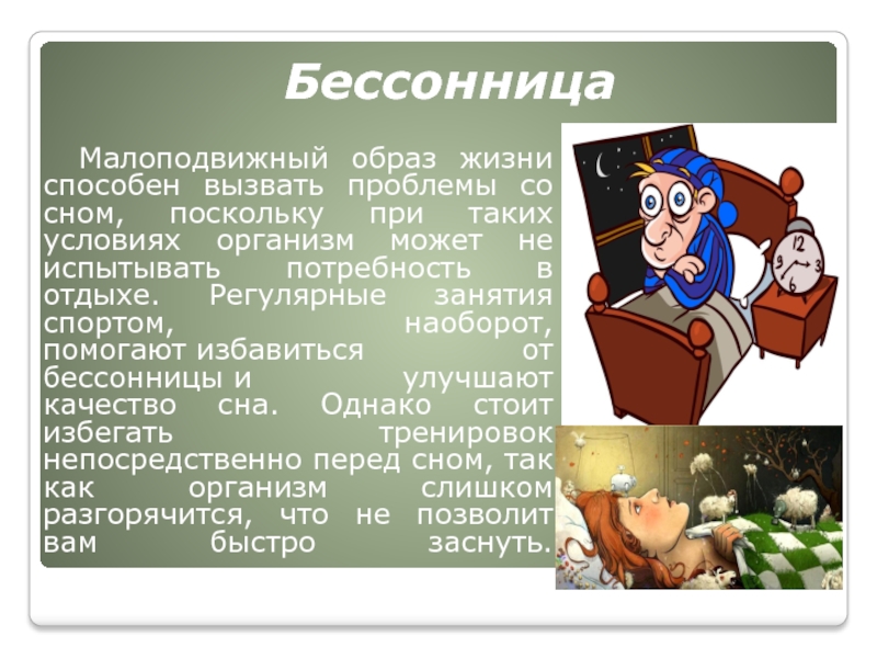 при таких условиях организм может не испытывать потребность в отдыхе. Регулярные занятия спортом, наоборот, помогают избавиться от бессонницы и улучшают качество сна. Однако стоит избегать тренировок непосредственно перед сном, так как организм слишком разгорячится, что не позволит вам быстро заснуть.