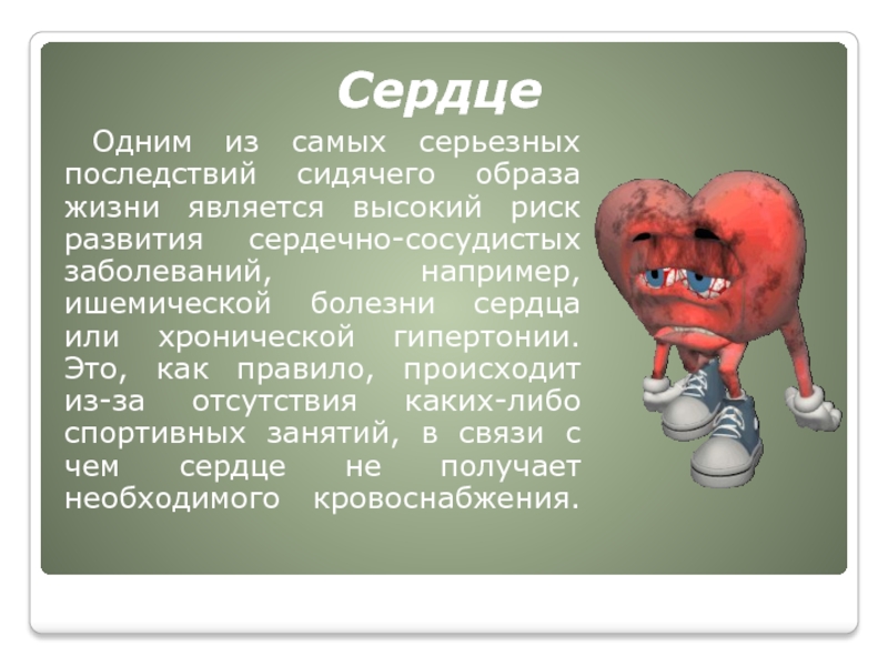 риск развития сердечно-сосудистых заболеваний, например, ишемической болезни сердца или хронической гипертонии. Это, как правило, происходит из-за отсутствия каких-либо спортивных занятий, в связи с чем сердце не получает необходимого кровоснабжения.