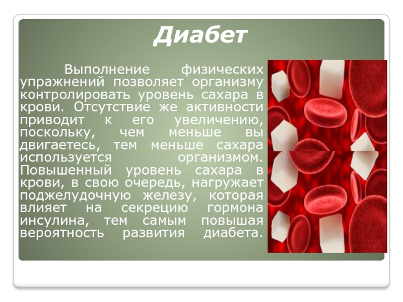 Отсутствие же активности приводит к его увеличению, поскольку, чем меньше вы двигаетесь, тем меньше сахара используется организмом. Повышенный уровень сахара в крови, в свою очередь, нагружает поджелудочную железу, которая влияет на секрецию гормона инсулина, тем самым повышая вероятность развития диабета.