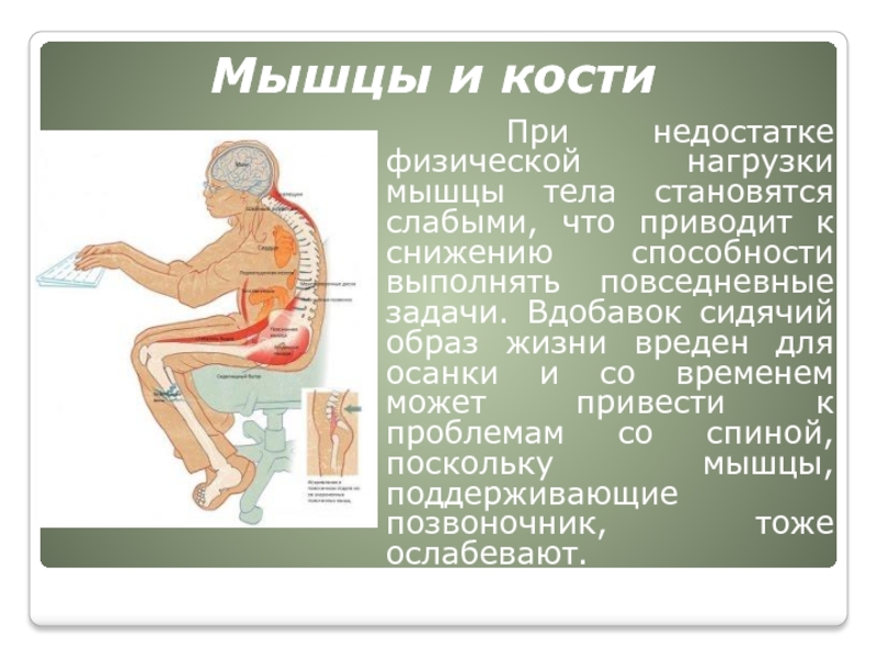 что приводит к снижению способности выполнять повседневные задачи. Вдобавок сидячий образ жизни вреден для осанки и со временем может привести к проблемам со спиной, поскольку мышцы, поддерживающие позвоночник, тоже ослабевают.
