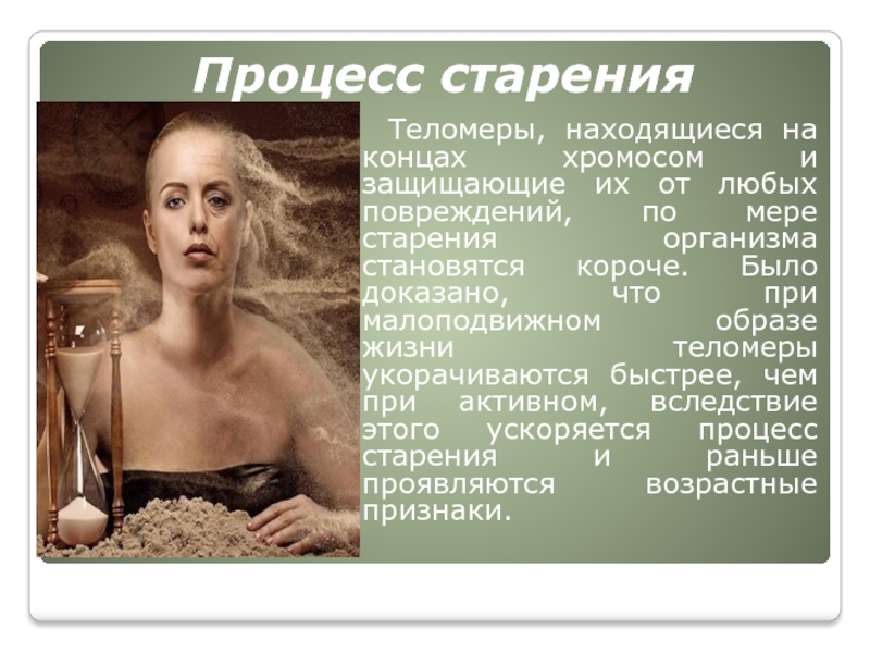 от любых повреждений, по мере старения организма становятся короче. Было доказано, что при малоподвижном образе жизни теломеры укорачиваются быстрее, чем при активном, вследствие этого ускоряется процесс старения и раньше проявляются возрастные признаки.