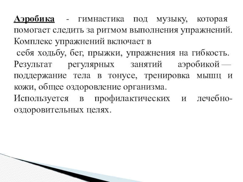 Спортивная аэробика. Как вид спорта она представляет собой некий синтез элементов гимнастики, акробатики, базовой аэробики и танцев.