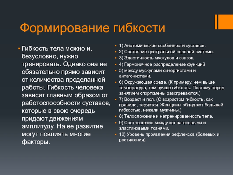6) Окружающая среда. (К примеру, чем выше температура, тем лучше гибкость. Поэтому перед занятием спортсмены разогреваются.)