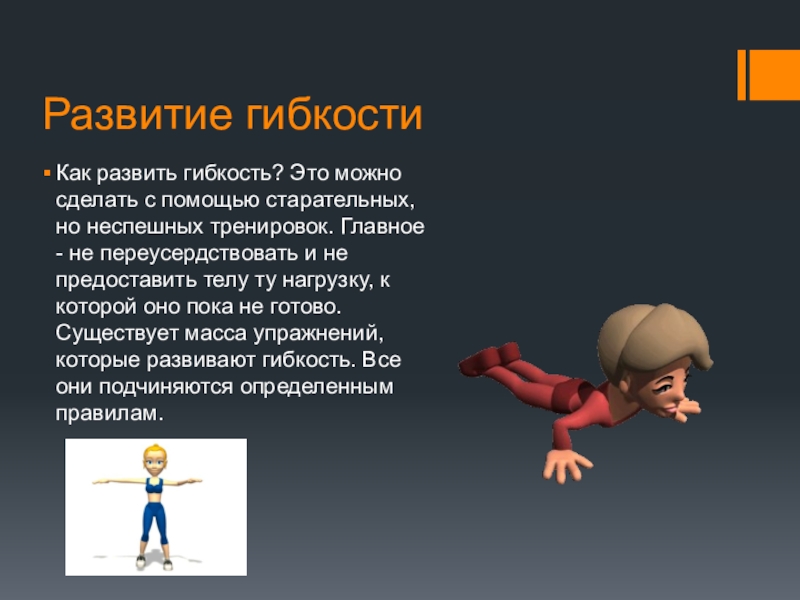 2) Гибкость повышает выносливость тела и стойкость к вирусам. Обладая хорошей гибкостью, можно достичь высоких результатов физического развития, что неуклонно влияет на здоровье.