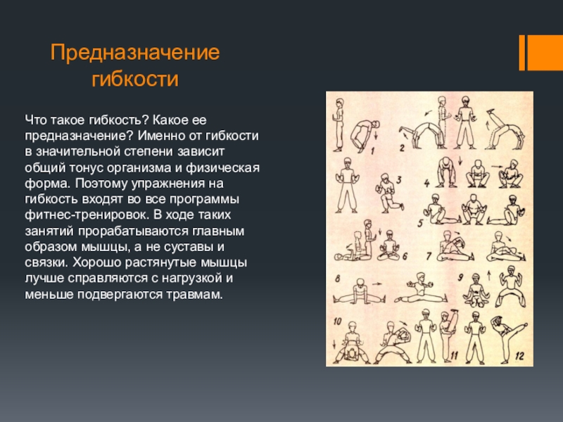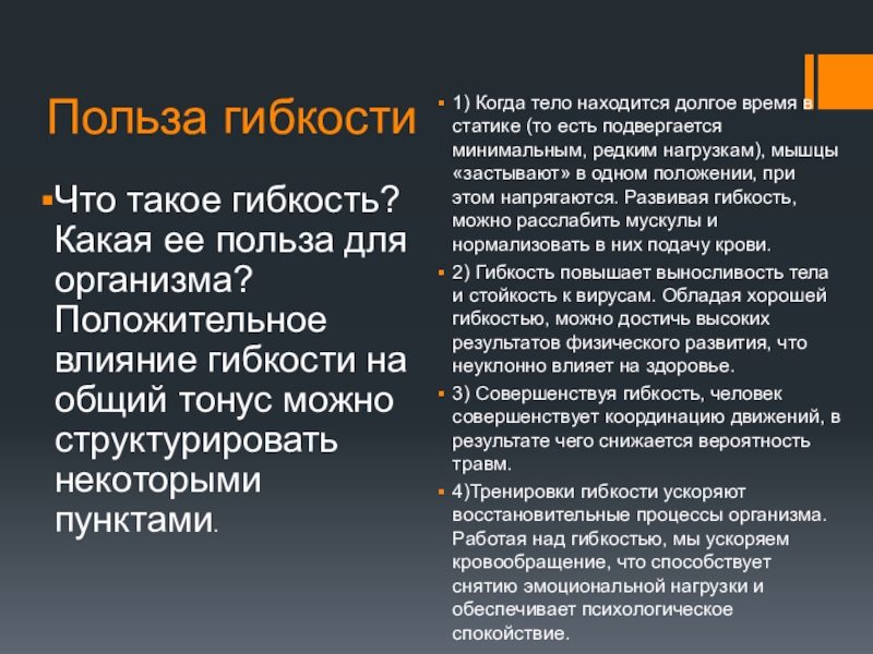 1) Когда тело находится долгое время в статике (то есть подвергается минимальным, редким нагрузкам), мышцы «застывают» в одном положении, при этом напрягаются. Развивая гибкость, можно расслабить мускулы и нормализовать в них подачу крови.