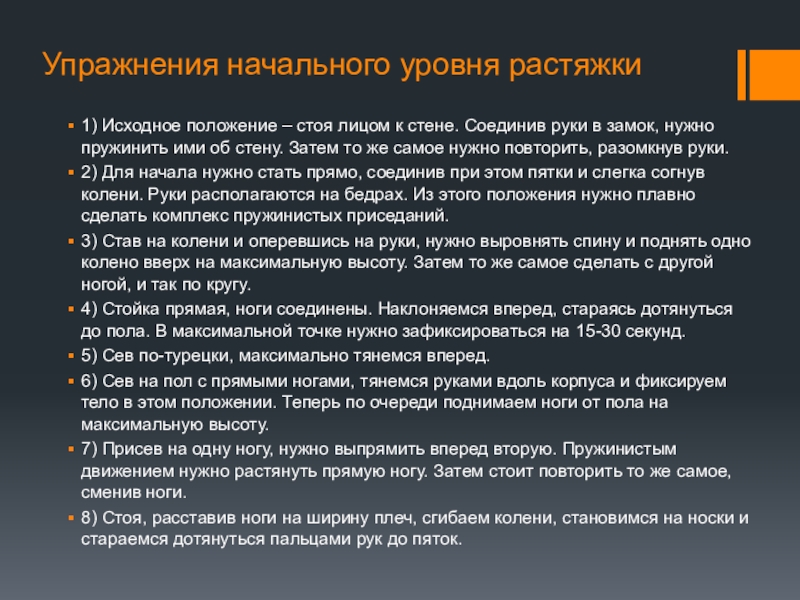 4)Тренировки гибкости ускоряют восстановительные процессы организма. Работая над гибкостью, мы ускоряем кровообращение, что способствует снятию эмоциональной нагрузки и обеспечивает психологическое спокойствие.