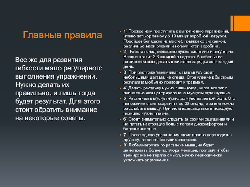 Все же для развития гибкости мало регулярного выполнения упражнений. Нужно делать их правильно, и лишь тогда будет результат. Для этого стоит обратить внимание на некоторые советы.