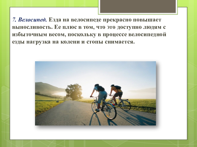 Слайд 127. Велосипед. Езда на велосипеде прекрасно повышает выносливость. Ее плюс в