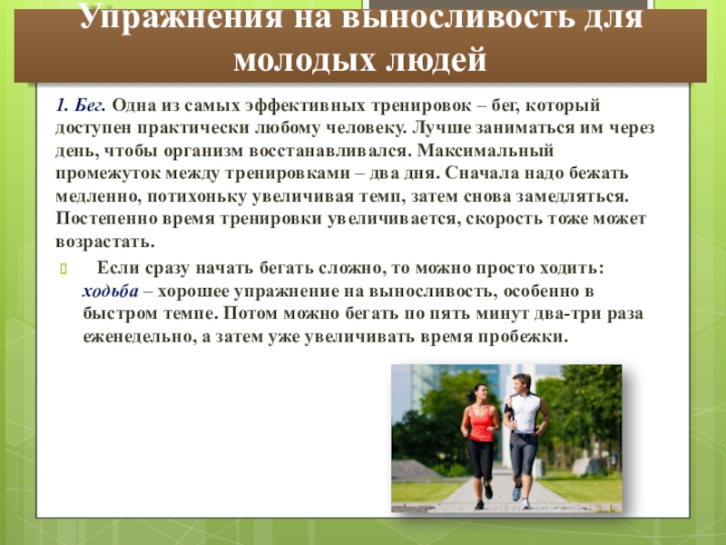 Слайд 6Упражнения на выносливость для молодых людей