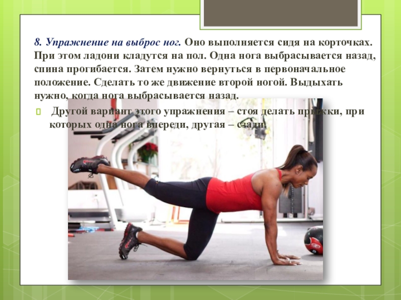 этом ладони кладутся на пол. Одна нога выбрасывается назад, спина прогибается. Затем нужно вернуться в первоначальное положение. Сделать то же движение второй ногой. Выдыхать нужно, когда нога выбрасывается назад.