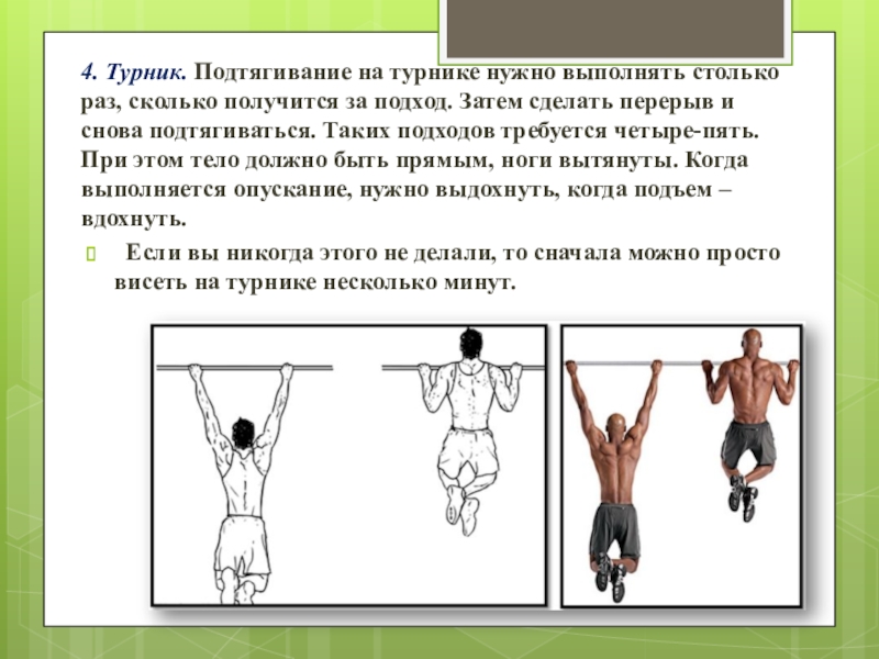 Слайд 94. Турник. Подтягивание на турнике нужно выполнять столько раз, сколько получится