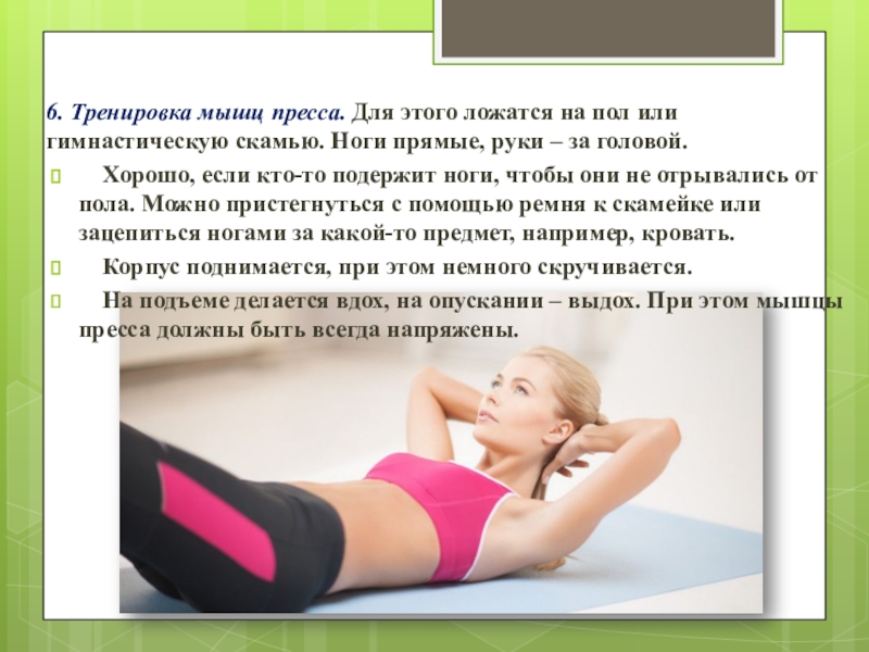 Слайд 116. Тренировка мышц пресса. Для этого ложатся на пол или гимнастическую