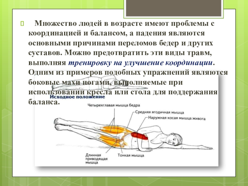 балансом, а падения являются основными причинами переломов бедер и других суставов. Можно предотвратить эти виды травм, выполняя тренировку на улучшение координации. Одним из примеров подобных упражнений являются боковые махи ногами, выполняемые при использовании кресла или стола для поддержания баланса.