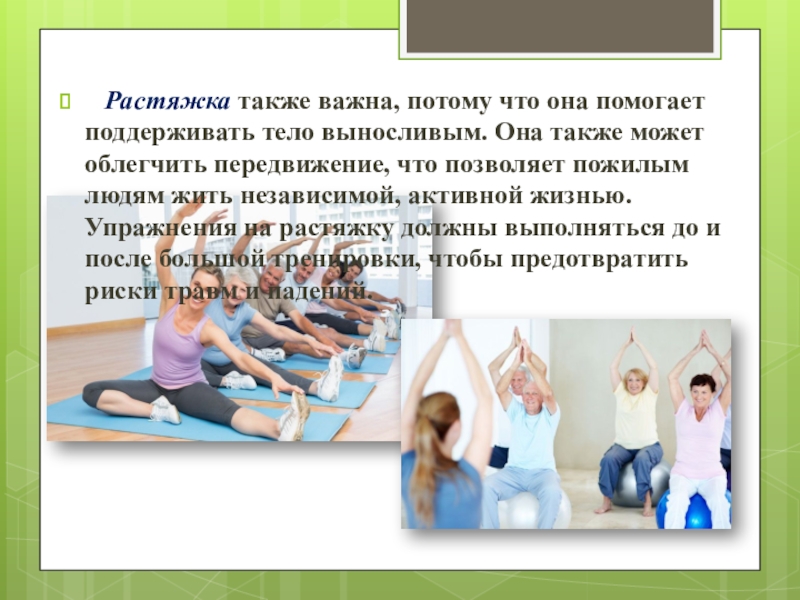 выносливым. Она также может облегчить передвижение, что позволяет пожилым людям жить независимой, активной жизнью. Упражнения на растяжку должны выполняться до и после большой тренировки, чтобы предотвратить риски травм и падений.