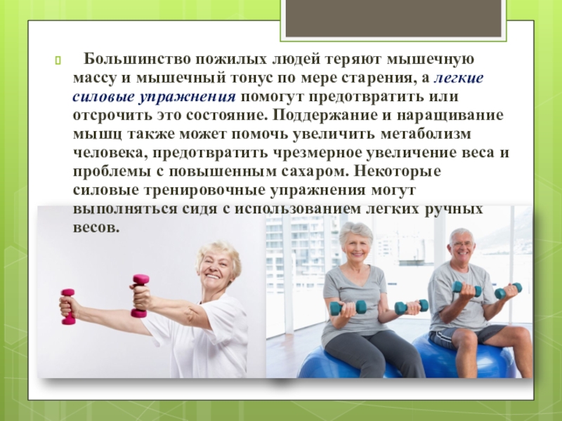 по мере старения, а легкие силовые упражнения помогут предотвратить или отсрочить это состояние. Поддержание и наращивание мышц также может помочь увеличить метаболизм человека, предотвратить чрезмерное увеличение веса и проблемы с повышенным сахаром. Некоторые силовые тренировочные упражнения могут выполняться сидя с использованием легких ручных весов.