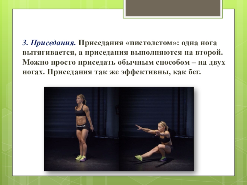 Слайд 83. Приседания. Приседания «пистолетом»: одна нога вытягивается, а приседания выполняются на