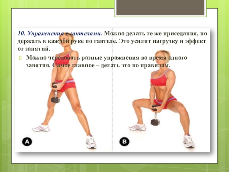 Слайд 1510. Упражнения с гантелями. Можно делать те же приседания, но держать